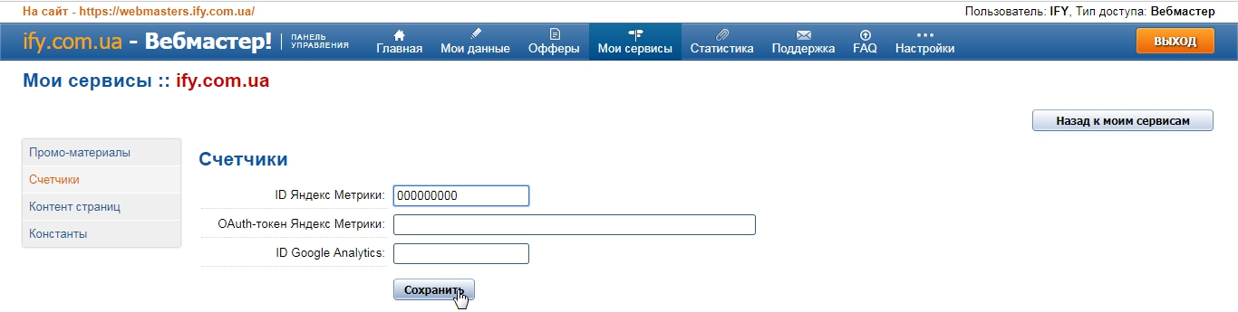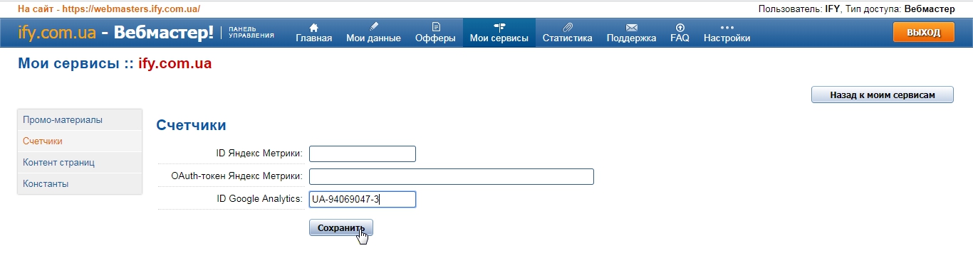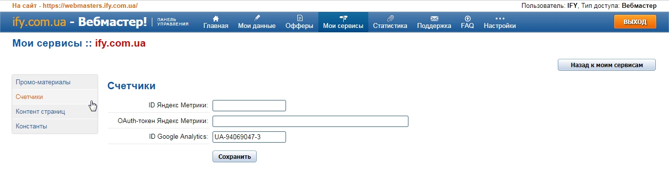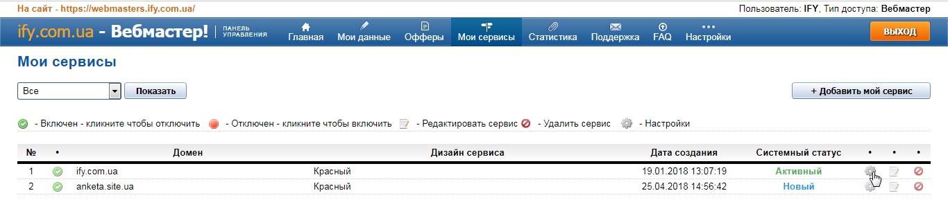 "Мои сервисы" на нужном нам сервисе нажимаем