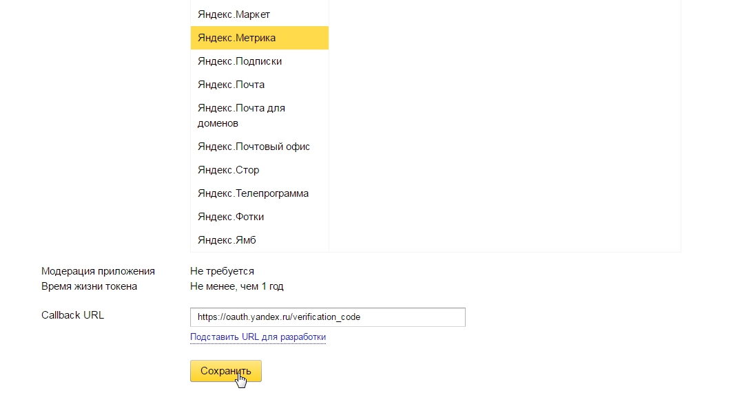 Подставить URL для разработки он подставит в поле сам https://oauth.yandex.ru/verification_code